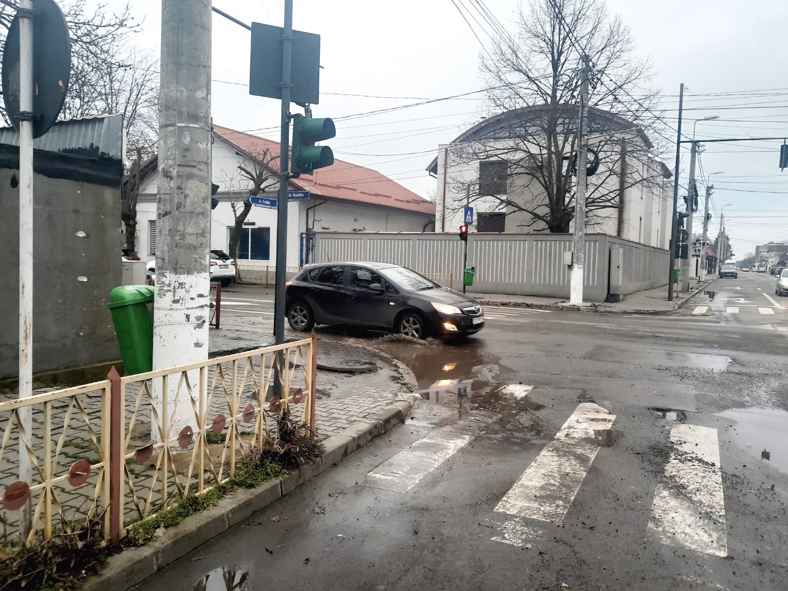 Canalizarea care preia apa fluviala din intersectie este infundata. Datorita gardului ce delimiteaza carosabilul pietonii nu pot traversa